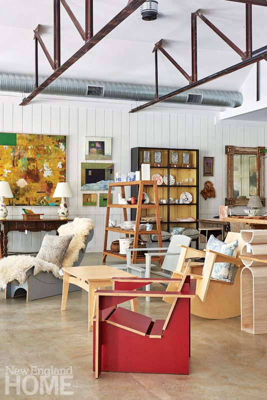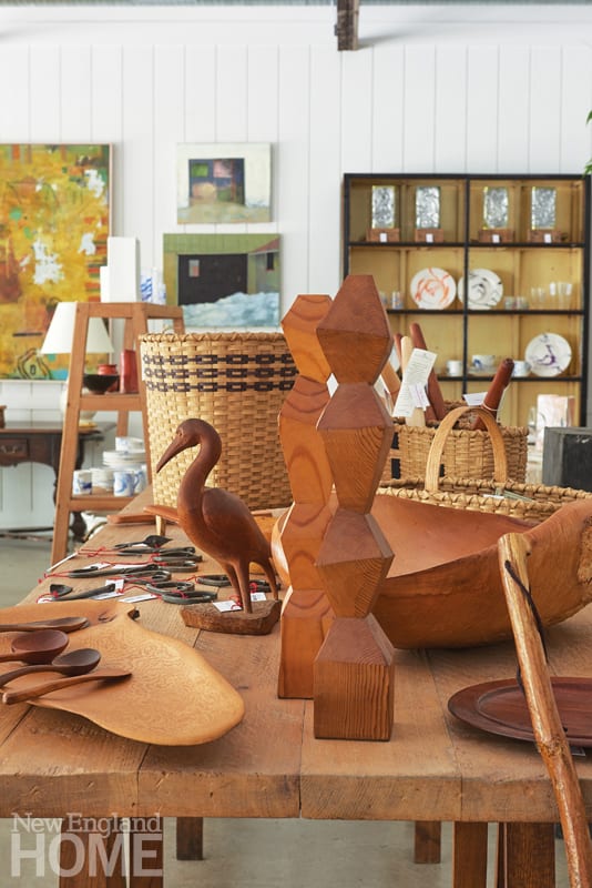 Pieces by more than fifty artisans are displayed in the capacious space—from hand-blown glass and hand-thrown pots to hand-knit sweaters and hand-crafted furniture (hand being the operative word here). A shop on this grand scale wasn’t really on Bunny’s radar; she was just always saddened and a little intrigued by a rundown former grocery store in town. “I always felt it needed some love,” she says, “I envisioned a wide porch and rocking chairs. I wanted to do something with it—but what?”