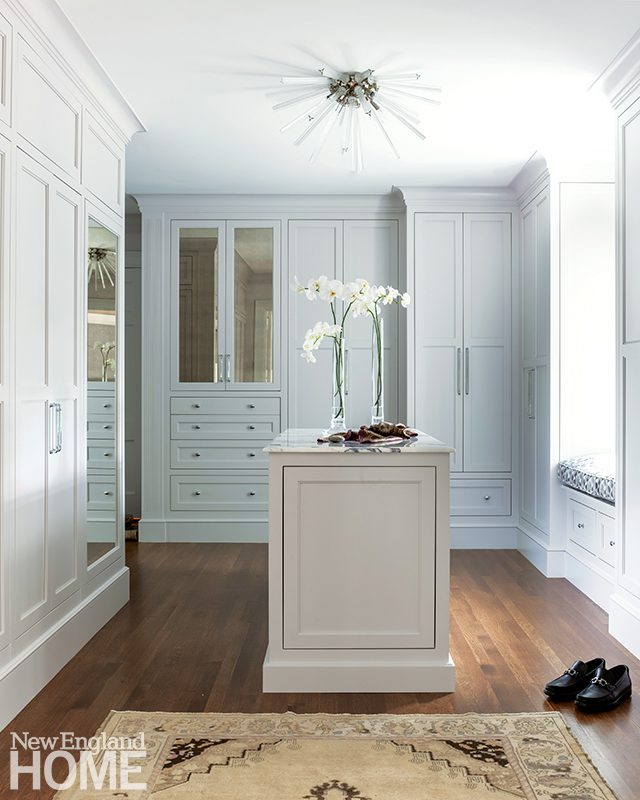 Several years after decorating a family’s Milton, Massachusetts, residence, Roisin Giese of Twelve Chairs Interiors was called back to tackle a renovation that included a new kitchen, mudroom, and primary suite. With the help of FBN Construction, Giese conceived the latter—containing a bath and dressing area in addition to the bedroom—by reworking what was formerly two bedrooms and a smaller en suite bathroom. “The homeowners have three children and wanted a respite,” explains Giese. “The house is an 1895 Colonial Revival, so we kept the palette timeless and classic.” To make the new bath feel like it has always been there, Giese asked FBN Construction to recreate the original wainscoting in the entry hall for this space. This detail melds perfectly with a large original window (now the focal point above the tub) and the original doors that were repurposed as pocket doors. “There were a lot of structural and plumbing challenges that we overcame during this project, but we are most proud of the fact that we were able to match the existing architectural detail in the wainscoting,” says FBN Construction project manager Shalini Vattes. “It really helps solidify the look and feel of the house.”
