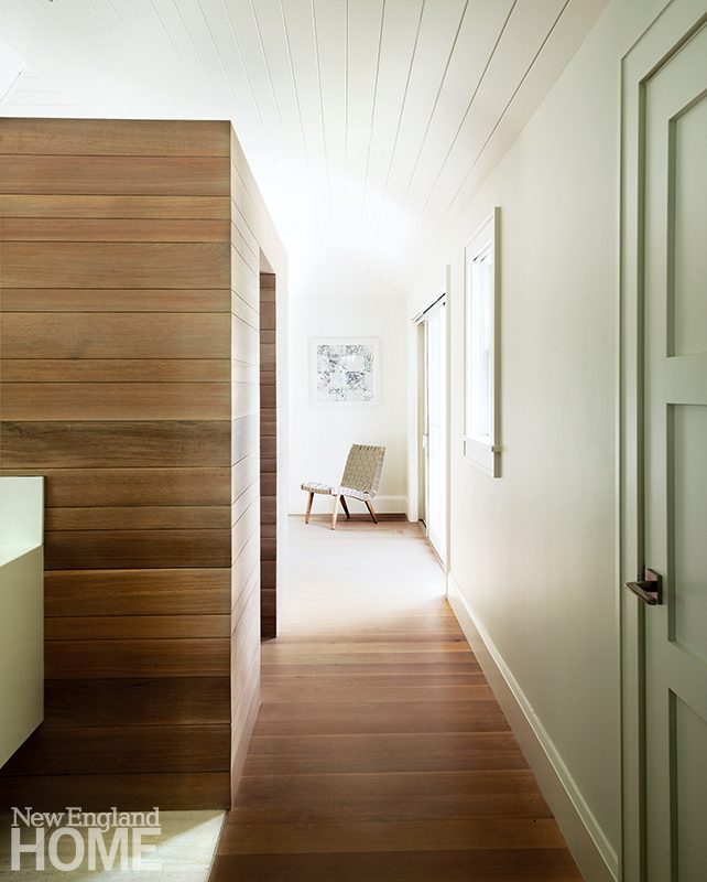 When Saltonstall Architects was tasked with renovating a 1968 waterfront ranch in Dartmouth, Massachusetts, the goal was clean-lined and modern, yet in keeping with the coastal New England vernacular. “The house wasn’t taking advantage of the views of the pool and the estuary beyond, so we expanded the windows and doors and enhanced the look and feel of the architecture,” says principal architect Will Saltonstall. High on the clients’ wish list for this vacation home was a new primary suite, so the firm transformed two former bedrooms and a dated yellow bath into the current suite, which includes a light-filled bedroom, a spacious bath, and a walk-in closet—all located under a new cathedral ceiling. To retain the open feeling of the high ceiling, the architects designed a floating cube to accommodate the closet while cleverly dividing the bedroom and bath. “The white-oak nickel gap on the cube features varying widths, which softens the modernism and makes it feel less perfect,” notes architect and project manager Tristan deBarros. “Plus, the wood has a weathered look that lends itself to a coastal environment.”