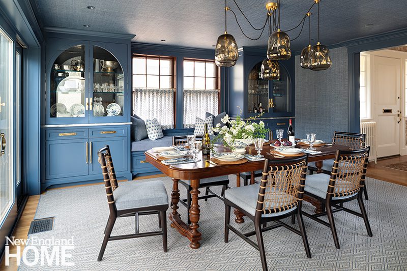 In the dining room, built-ins house heirloom china on one side and a secret wet bar on the other. “They really wanted to have good entertaining space in the house, so a lot of what was executed lends itself to that,” says Brown.