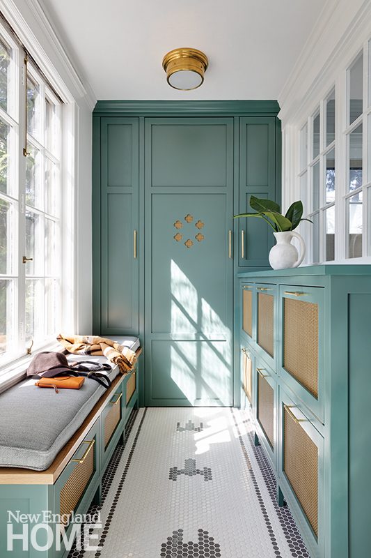 Off the side entrance, Conti captured space from the family room for a new mudroom with custom tip-out bins for shoes, a window seat, and a deep coat closet. While the design is French inspired, the playful tile pattern is a Star Wars reference.