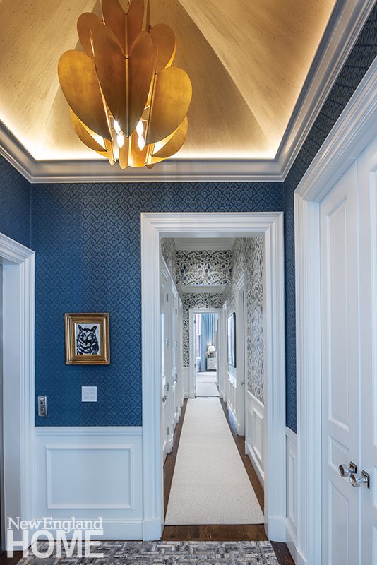 The designers set a literal gold standard at the entry, where a crown-worthy lighting fixture hangs from a gilded vaulted ceiling. In keeping with the couple’s penchant for blues, the entry’s walls are papered in a lapis Schumacher grasscloth.