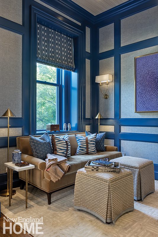 The long, twelve-foot-ceilinged living room presented the first furnishing challenge. “The main thing to solve was positioning chairs and hanging a TV over the fireplace,” says Fremont-Smith. She and Lewis created a tight seating area anchored with loveseats while placing an oblong dining table in the room’s windowed bay. A wallpapered ceiling visually lowers the windows and, as Lewis says, “provides texture.” Fremont-Smith adds, “The paper reflects natural light and adds chic-ness.”