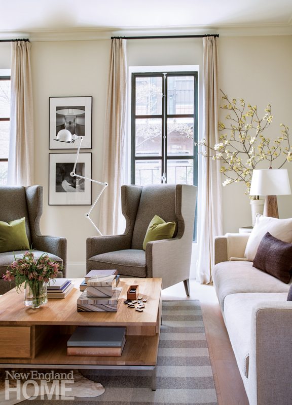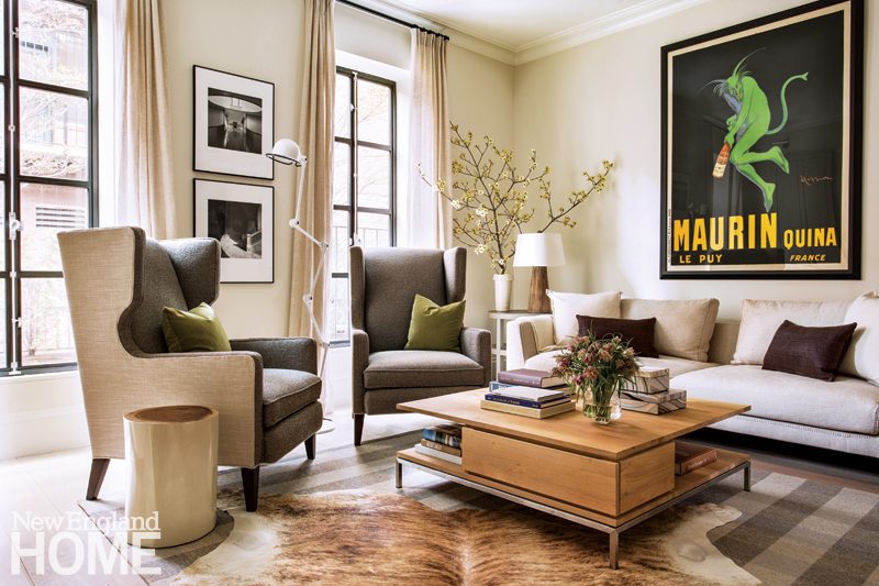The front parlor’s serene vibe continues down the hall into the back parlor, too. Here, a casual cowhide tops a custom Merida rug, and there’s a generous Ethnicraft coffee table big enough for all three family members to put up their feet at once. Above the sofa hangs a vintage poster, and a pair of Andrea Star -Greitzer’s photographs are displayed near the tweed-lined wing chairs. “The art was the only thing we didn’t buy for this house,” says Irving. “The owners brought it all with them.” The new gorgeous European-style metal windows, on the other hand, were the designer’s idea. “They make the room feel like Paris,” she says.