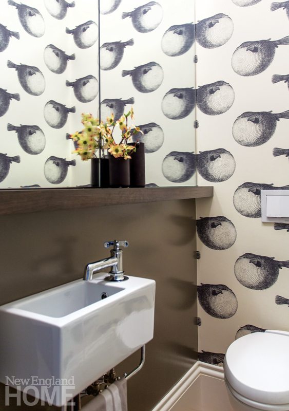 The enviable cooking area spills right into an intimate family room where a gas fireplace is set like a jewel into an unabashedly contemporary limestone wall. Since this room is three steps down from the street, Irving added pull-up shades to give privacy without diminishing natural light. White oak shelving (backed with the same Phillip Jeffries wallpaper as the shelves in the front parlor) and cabinetry echo the woodwork found throughout the house. Another custom Merida rug adds a soft touch. And accommodating the Italian sofa is a live-edge oak log table—once part of a mighty frigate ship—salvaged from the Charlestown Navy Yard.