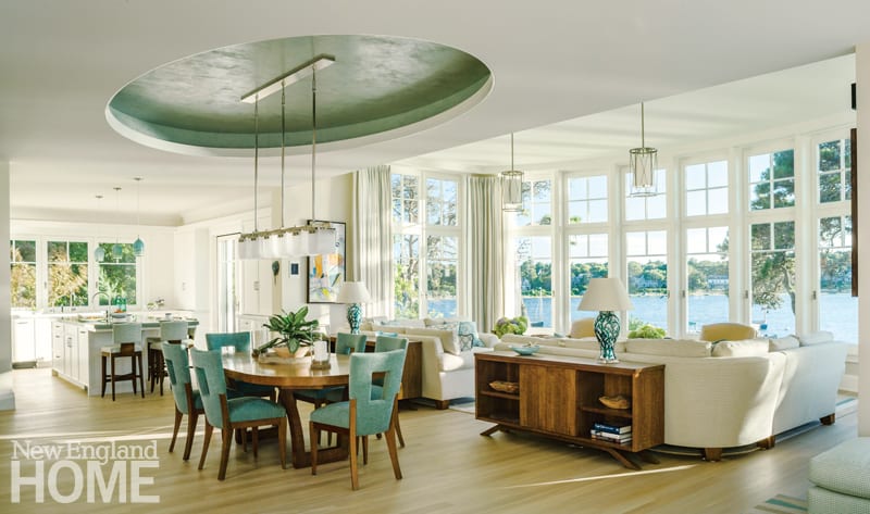 Fine complemented Nicholaeff’s architecture with clean-lined, transitional furniture against a palette of soft neutrals with splashes of color that speak to the waterside location. In the open-plan living area, Nicholaeff used varied ceiling heights, including a recessed oval coffer above the dining table, to define the spaces. Fine gave the recess a venetian-plaster treatment in a pretty sea-blue hue, then surrounded the Keith Fritz dining table with Dakota Jackson chairs outfitted in bright aqua fabric.