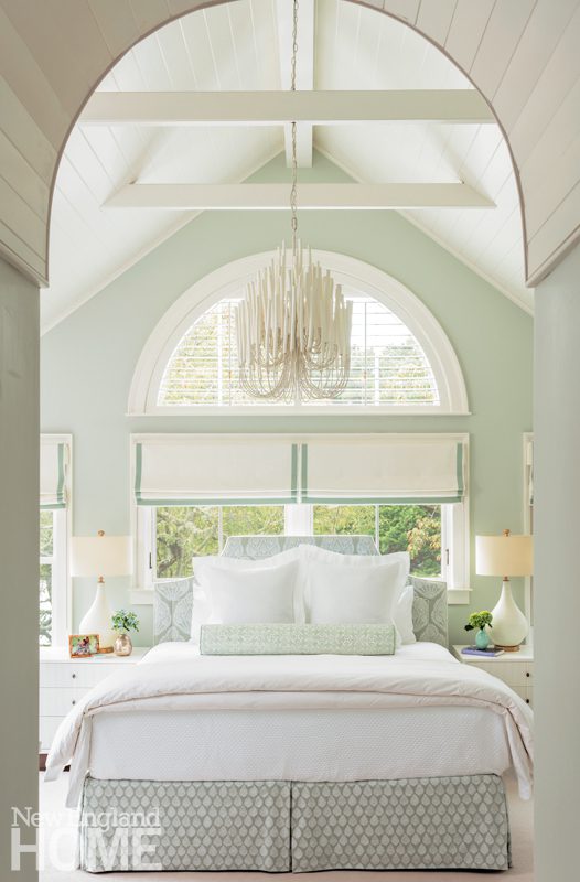 The palette softens to barely there in the master bedroom, where a whitewashed wood chandelier hovers over a bed outfitted in the palest blue-green linens, and the walls wear little more than a whisper of seafoam green.