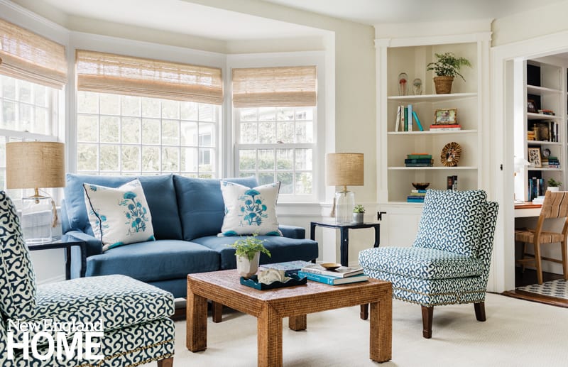 The designer obliged the homeowner’s love of blue throughout the home. In the den, a marine-blue sofa is joined by twin lounge chairs clad in a knockout fabric of navy and white embellished with turquoise embroidery.