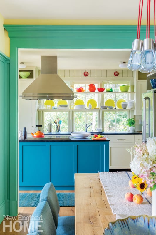The bold palette repeats throughout the house, even in the kitchen, where an azure island anchors the space, and the pale sage cabinets and walls get an energetic boost from the bright yellow, orange, and green plates perched on open shelves that run across the windows.