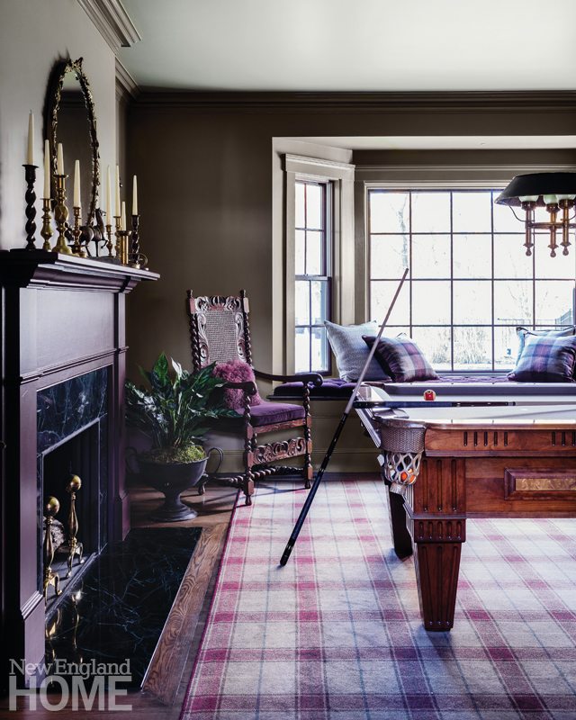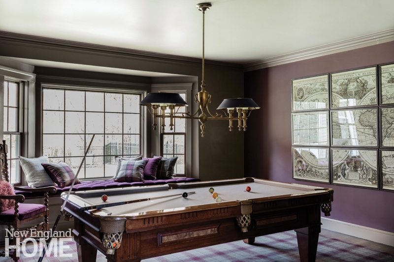 Functionality—with a stroke of fun—also rescued the living room. In place of two lonely wingchairs, Sanborn introduced an antique pool table, outfitted the bay window as a cushioned bench seat, and cloaked it all in tones of gray and purple. The wall colors weave together in a tartan rug.
