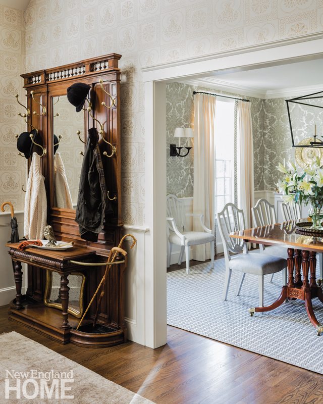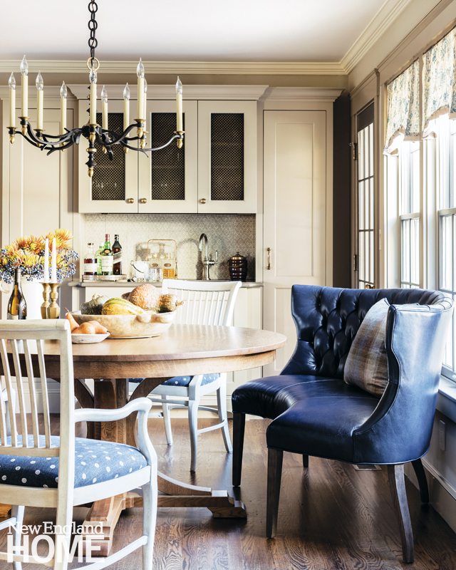 At the same time, she upended the home’s traditionalism with creative approaches that sent predictability packing. In the dining room, the couple’s mahogany table and matching shield-back chairs were elegant, but all too familiar. Sanborn had the chairs stripped, painted light gray, and reupholstered, creating a contrast that emphasizes the table’s detailing. She placed them all atop a wool-and-jute rug. “It gives the room a crisper, fresher feel, even though it’s still formal,” she says.