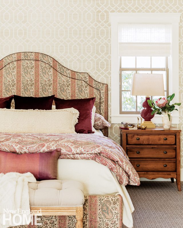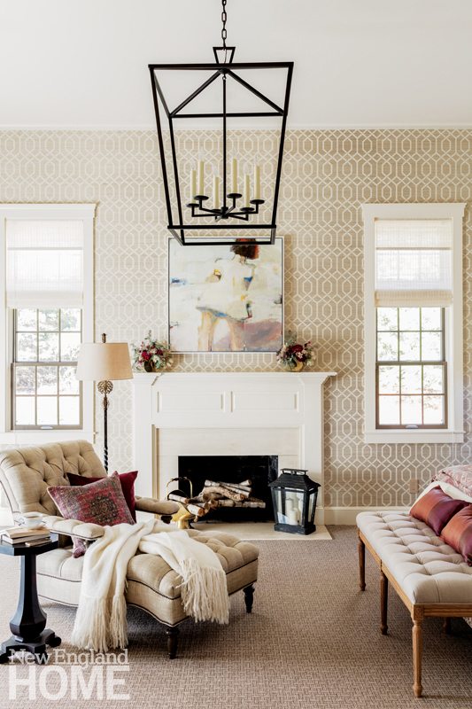 Architectural missteps included an oddly angled wall in the dining room and a host of troubles in the great room, among them a partially vaulted ceiling that clashed with the room’s graceful Serlian window. Smoothing out these architectural glitches would be the first step in making those rooms more inviting. But the rest of the rooms needed attention as well. To bring them alive, Sanborn would apply “layers”—wallcovering and paint, carpeting, millwork, artwork, furniture, window treatments, accessories, lights—with each stratum contributing to the beauty and comfort of the room.