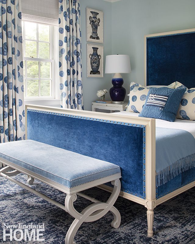 Equally unexpected is the family room, where Pomeroy gave the faded old wood paneling new life by painting it Farrow & Ball’s moody Claydon Blue. “We did it in high-gloss, and the transformation was really dramatic,” says the designer.