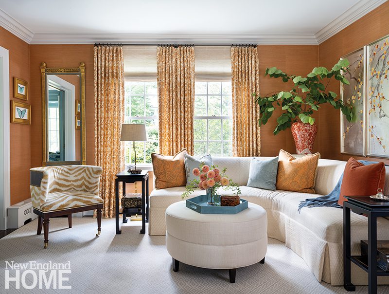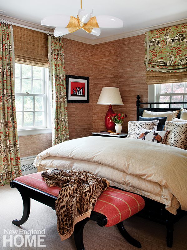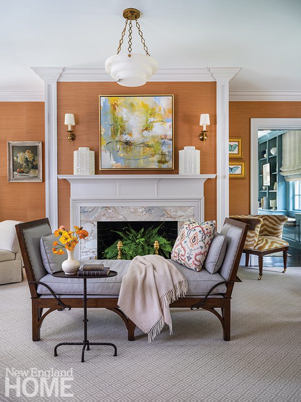 The quiet palette of the foyer and dining room takes a dramatic turn in the living room, where white-painted architectural details pop against walls sporting a luxe cinnabar-hued grasscloth. Again, Pomeroy freely mixes styles, setting a chaise with a nineteenth-century vibe in front of the fireplace and outfitting a seating area with a transitional curved sofa and a wide barrel-back chair in a frisky zebra print. “The zebra print is an unexpected pattern that really enhances the space,” he says.