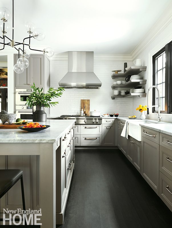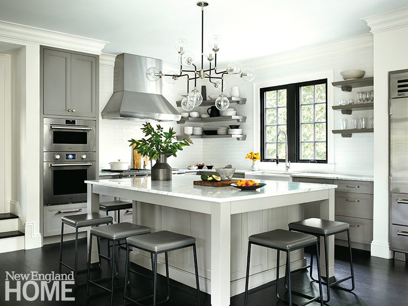 Andrew Reck of Oak Hill Architects was tapped to inject new life into this 1907 residence in Brookline, Massachusetts. “The house has beautiful bones, but it was designed for how people lived 100 years ago, not for today,” explains Reck. “The goal was to transform the home into something that suits this family’s needs and contemporary taste while being respectful of the original structure.” As part of the renovation and expansion, an old service stair was removed and a light-filled keeping room was added onto the kitchen to improve circulation between the kitchen and the rest of the main floor as well as the kitchen and the backyard. Additionally, a new pantry connects the kitchen to the dining room. “The pantry functions as a wet bar, but it feels like an Old World butler’s pantry,” says Reck of the sleek space, which features the same cabinetry as the adjacent kitchen and contains plenty of storage for wine and glassware. “It’s an important element of the main floor’s circulation,” says Reck. “Creating flexible spaces allows the house to breathe. Prior to the renovation the kitchen felt dark and internal, but now there’s tons of natural light and a stronger connection to the backyard.”