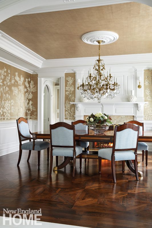 Opulent touches like the foyer’s quartz chandelier, the living room’s beaded chandeliers, and the dining room’s metallic chinoiserie wallpaper lend an elegant look. “I like to say it has a bit of a Park Avenue feel,” Haines says. “It depicts an era of glamour and style.”