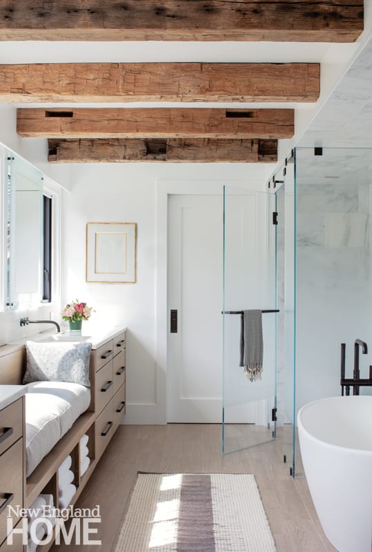 It’s very much a handmade house, with an agrarian edge that sets it apart from the more formal estates in the area. Its roof shingles and siding are Alaskan yellow pine, softening to gray at the edges. The walls inside the entry are clad with raw steel with a swirling milled finish. Ragged wooden beams salvaged from Pennsylvania barns, their hand-cut mortises visible, span plaster ceilings. Reclaimed wood of a later vintage was used to build a section of the kitchen island, along with a pair of tables and a bench in the breakfast nook. All three were crafted by master carpenter John Sweeny from a tree that once stood in the yard of some friends of the homeowners.