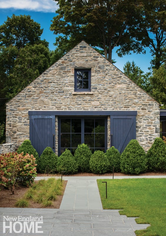 In the case of this Fairfield County home, the rock ledge resting just below the earth’s surface would become more than an obstruction to be removed. It would become a natural choice to adorn the new home’s gables, chimneys, fireplaces, and garden walls.