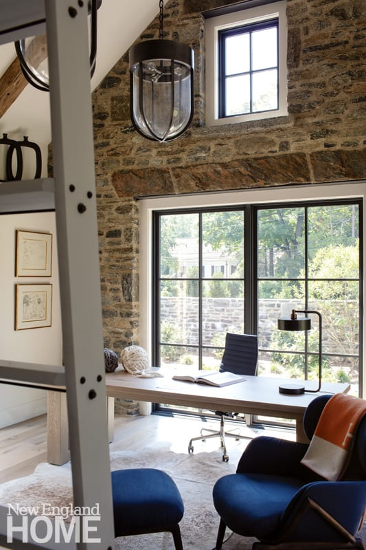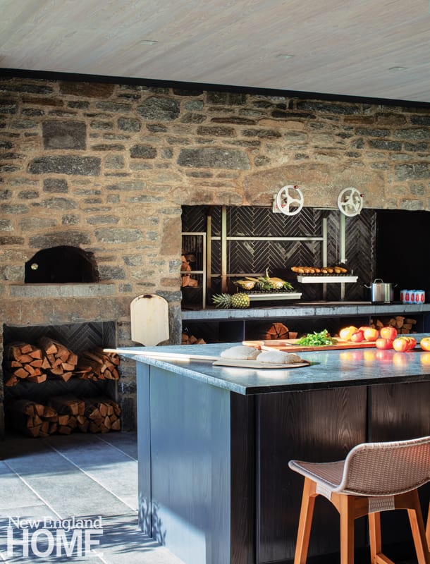 There was a lot of stone there. “We excavated 5,000 cubic yards of rock,” says builder Paul Fontana, noting that the volume of the ledge effectively expands as it’s pulled from the ground. “When you blast rock, it fluffs up, like when you’re baking muffins,” he says. This isn’t the first house Fontana has built using native ledge. Nor is it for Tony Pelosi, his head stonecutter, whom Fontana describes as “the world’s last gray-haired Italian mason, right out of central casting.” It was Pelosi, along with three assistants, who created the home’s veneers that read as solid walls and its hand-built fireboxes with herringbone linings.