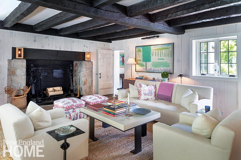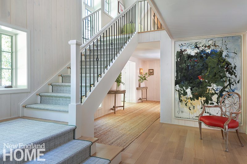 “The floor plan was compartmentalized and difficult to navigate,” Hauck explains, so he removed interior walls and relocated the staircase to improve circulation and bring in more light. In the original living room, which boasts a massive stone fireplace, he retained the ceiling’s wood timbers, which were imported from Scotland. He then sanded down the dark English pine paneling to create a better backdrop for the couple’s collection of Joan Mitchell and Milton Avery paintings.