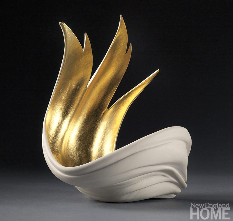 Almost every piece Jennifer McCurdy creates in her Vineyard Haven studio is crafted of unglazed white porcelain. Now and then she gilds the interior surfaces with 23-karat gold, but moast often she leaves the pure white material in its natural form. The thinness of the porcelain gives the pieces their translucency and lets McCurdy explore the structure, rather than just the surface, of her vessels.