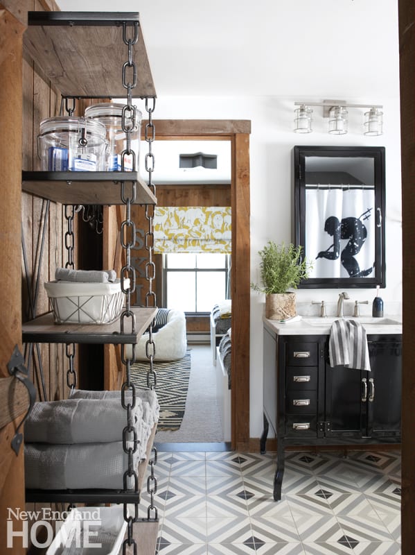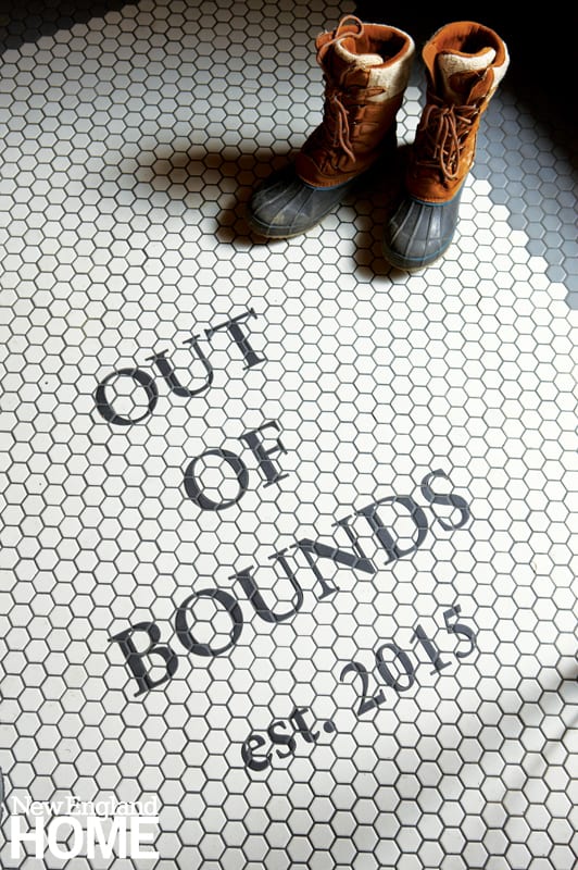 One of her favorite custom touches? The Ehrlichs named the house “Out of Bounds” due to its proximity to a local ski mountain—not quite ski-in-ski-out, but just beyond the property lines—and as a play on how they view their time at their Vermont hideaway. They immortalized the moniker around the house: on a sign commissioned from the company that makes the ski mountain’s actual trail signs; on a custom-made shower curtain; and laser-cut on the black-and-white tile floor of the mudroom, inviting their guests into a little bit of their family story. “Early on, my husband and I said, ‘We want to have family memories when our children are grown.’ When we’re there, we’re a family unit; we don’t let other things distract us.” Indeed, the memories are piling up every weekend the Ehrlichs spend out of bounds in their very own snow globe retreat.
