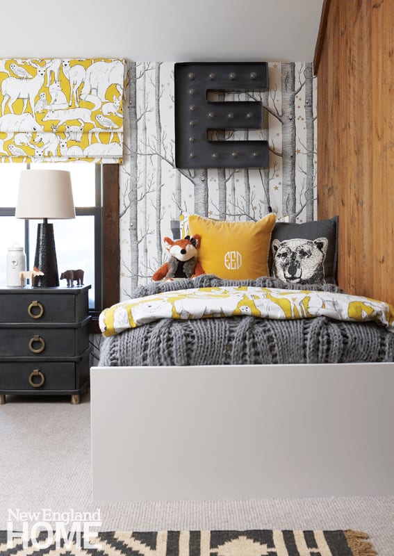 Blending that rustic cabin feel with a sleek, updated vibe is a testament to Ehrlich’s nuanced vision—and proof that a mountain house can have antler chandeliers without feeling kitschy and herringbone porcelain flooring without looking too modern. A palette of warm woods and cool grays is punctuated with bright mustard yellow in the window treatments in the kids’ room and the occasional stool or pillow.