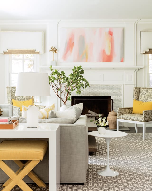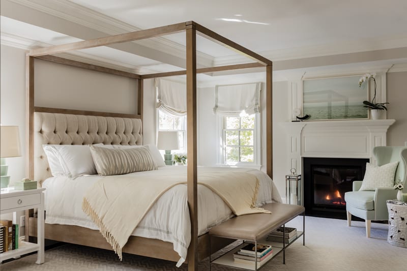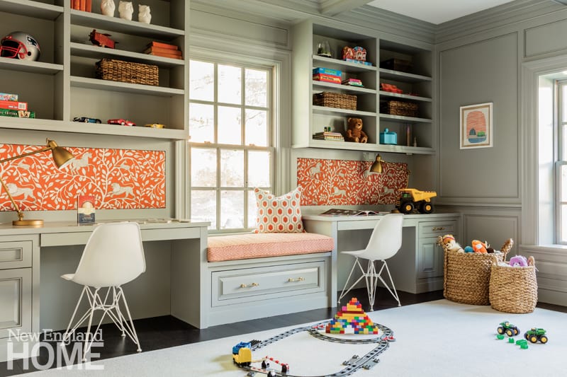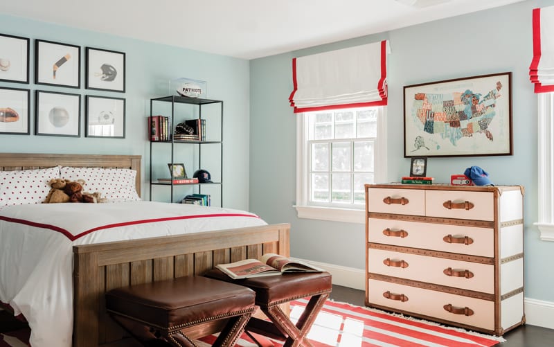 Gates also points out in her book—and in practice—that parents need dedicated spaces as much as their children do. The Wellesley house has two such refuges: the master bedroom, with its sheltering four-poster designed by Gates for Kristin Drohan, and the casually curated living room. Following the flood, Gates turned up the living room’s tranquility by replacing a wooden fireplace mantel with a simpler frame of marble and limestone that is flanked by room-balancing built-ins. On the floor, she layered a soft Moroccan rug over a slightly larger wool sisal—a move that employs two of the designer’s favorite tricks. “It looks more interesting when it’s layered, and it’s a way to add an expensive piece in a smaller scale,” she explains. Comfortable seating and an unpretentious cocktail table make the room cozy and approachable. “After the kids are in bed, we’ll flip on the gas fireplace and settle in with a glass of wine. It’s kind of a little sanctuary,” the wife says. “It’s probably our favorite room in the house.”