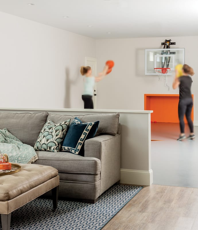 The remodel addressed other practicalities as well. A tiny shower was eliminated from a bathroom, making space for a pantry. In the nearby mudroom, storage cubbies were reconfigured into three wider ones. At the basement level, Kalah Talancy and Kevin ten Brinke of KT2 Design Group unified a cavern of separate areas, creating an open recreation level with a gym and basketball court, a kitchenette, and a cozy den for escaping New England’s long winters.