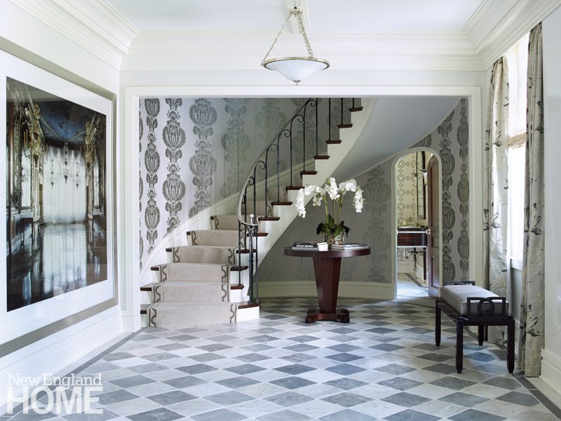 The Deco elements are most prominent in the master bedroom and bath upstairs and in the front of the house, particularly the foyer, powder room, and parlor. Shades of gray in the foyer’s tiles, the Lee Jofa wallcovering, a lacquered bench, and a Carlton table perfectly complement the spiral staircase and distinctive entry to the powder room.