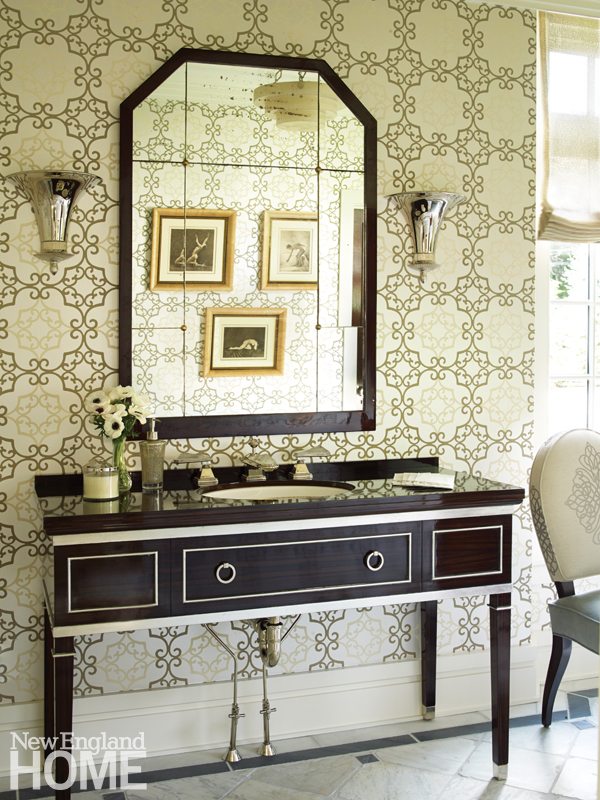 The powder room itself is a celebration of period style, with its glossy, dark-wood vanity and exposed plumbing backed by a nine-panel Parisian mirror and fluted nickel sconces. “We really wanted to glam it up to evoke the era,” says Ruderman.