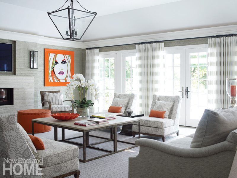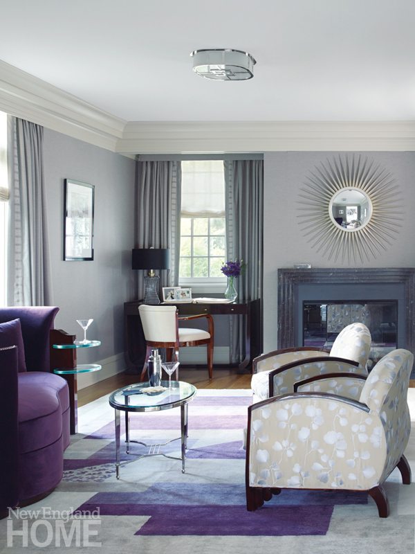Homeowners Karon and Lew Cohen split their time between Massachusetts and Florida, where the vintage Ocean Drive hotels of South Beach are the couple’s near-neighbors as well as a source of design inspiration. A former dressmaker, the Australian-born Karon is as much a fan of 1920s movies, style, and fashion as she is unmoved by traditional New England architecture and interior design.