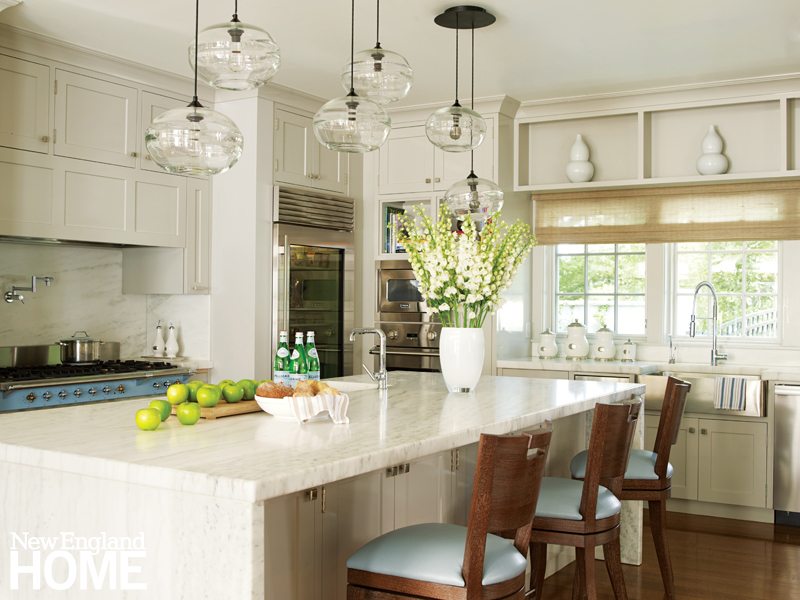 Shades of pale blues and grays create a more subtle sense of connectedness between the family room and the kitchen. In the latter, the Deco influence is less pronounced, but still evident in the blue Cluny 1400 Lacanche range and gray-lacquered kitchen cabinetry.
