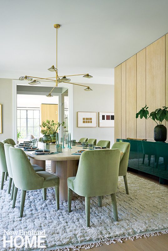 Throughout, the palette is a mix of subtle greens and soft mushroom tones. In the kitchen, cabinets painted Benjamin Moore Titanium, a pale gray with blue-green undertones, are set against the cerused-wood finish on the walls.