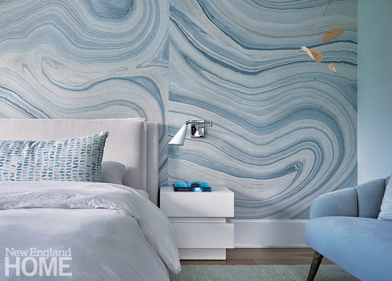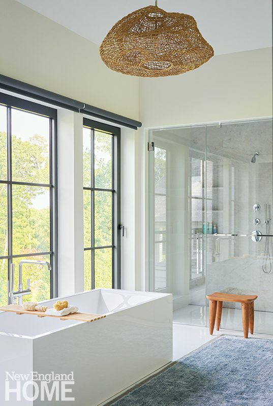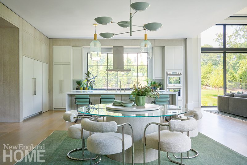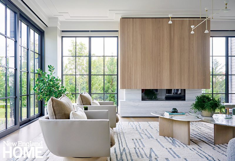 The intersection of old and new attitudes begins with the exterior. Tanner White, whose firm Tanner White Architects designed the 8,000-square-foot residence, calls it “updated traditional.” Shingled peaks familiar to the New England architectural landscape are dispersed on flat, modern datum lines to create the illusion of a floating roofline. The cladding is a combination of shingle siding and accents of horizontal shiplap boards given a modern edge with black framing around the impressive double-height entry and ten-foot-tall tilt-and-turn steel-frame windows.