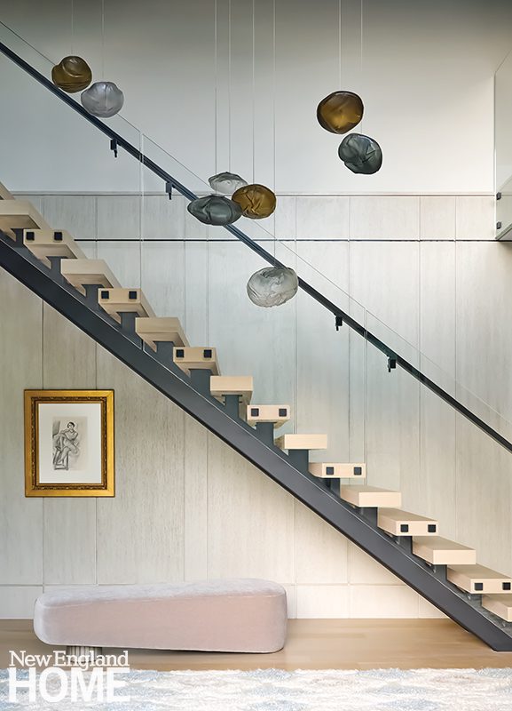 “I like that everything is simple,” says the owner. Simple, yet sophisticated as in the two-story entry foyer where the sculptural oak, steel, and glass staircase is itself a piece of art. It is beautifully complemented by a custom Random chandelier by Bocci. Its twenty pendant lights in three shades of smoky gray and blue green hover in suspended animation like little crystal spaceships. The foyer is grounded by a catwalk on the upper level designed by White to bring an “old library” look to the distinctly modern space.