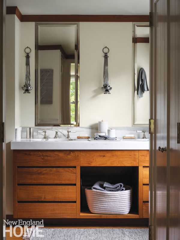 The oak floors and hickory paneling and cabinetry of the kitchen and casual dining area, installed during the initial renovation, still suited both the home and the homeowners, so, Ricci says, “We just refreshed, replacing dated accessories and letting the woodwork do the talking.” The primary bath, too, had stood the test of time. Here, Ricci switched up
