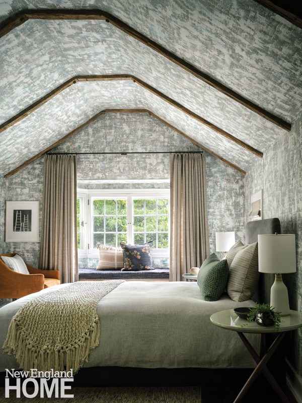 This time around, the house didn’t need any further architectural changes, so Ricci came back solo for a decorative refresh. “It started with a guest room that was part office,” she recalls. A plan to make a home office out of a room the kids had used for homework, music, arts, and play meant the guest quarters, situated in the original part of the house, could be dedicated to wrapping visitors in comfort and a bit of luxury. Rather than paper (“We didn’t want seams,” the designer says), Ricci brought in a decorative painter who treated the walls and ceiling to a faux finish in subtle hues of green, cream, and plum that echo the garden outside. “It feels really cozy,” Ricci says.