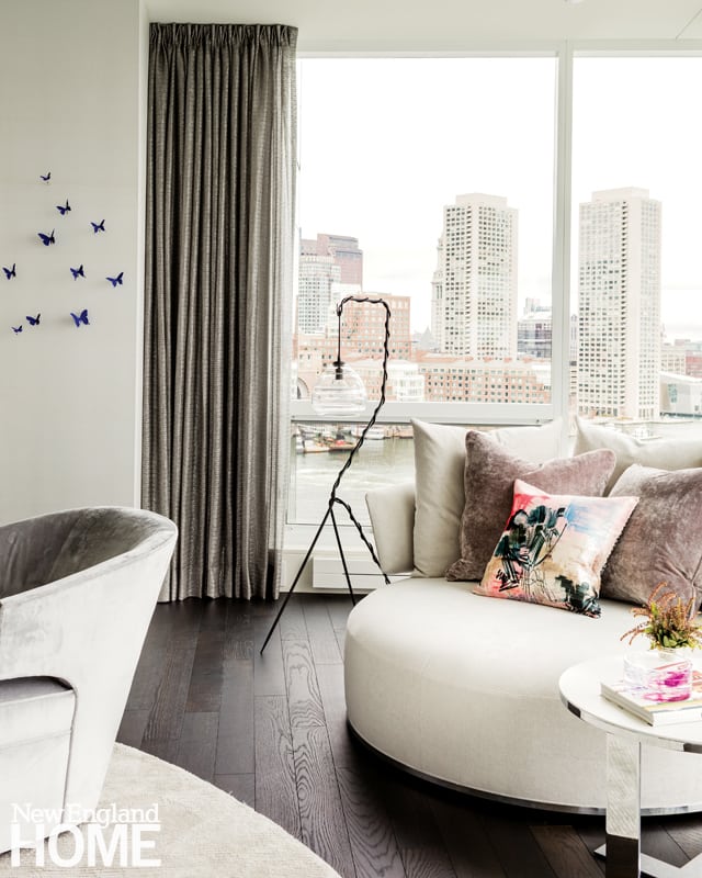The interior of a high-rise Boston condominium with dramatic views is suffused with glamour, elegance, and a touch of femininity.