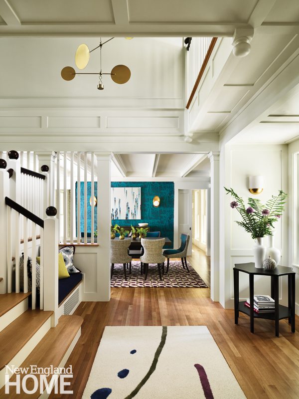 Materials and finishes also needed to be both kid- and dog-friendly, as the clients’ grown children often visit with grandkids and pets in tow. “They are a laid-back couple,” says Hirsch, “so it was important that the home feels comfortable and not overly designed. New England style is typically more traditional, but these clients challenged me to go off the beaten path to find the unusual.”