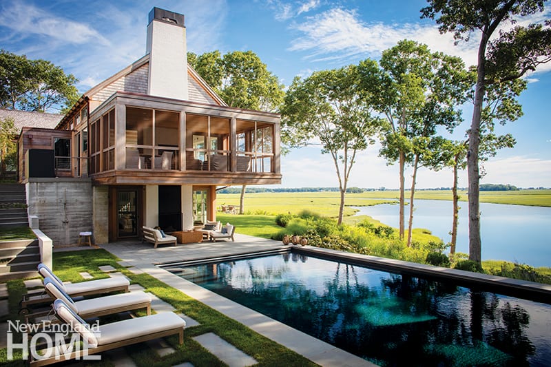 Their unique approach resulted in a unique home: a split-level nestled on a deep slope, with wide windows to frame breathtaking water views and a cantilevered screened porch that hovers over a pool deck, maximizing space without breaching a conservation-restricted footprint.