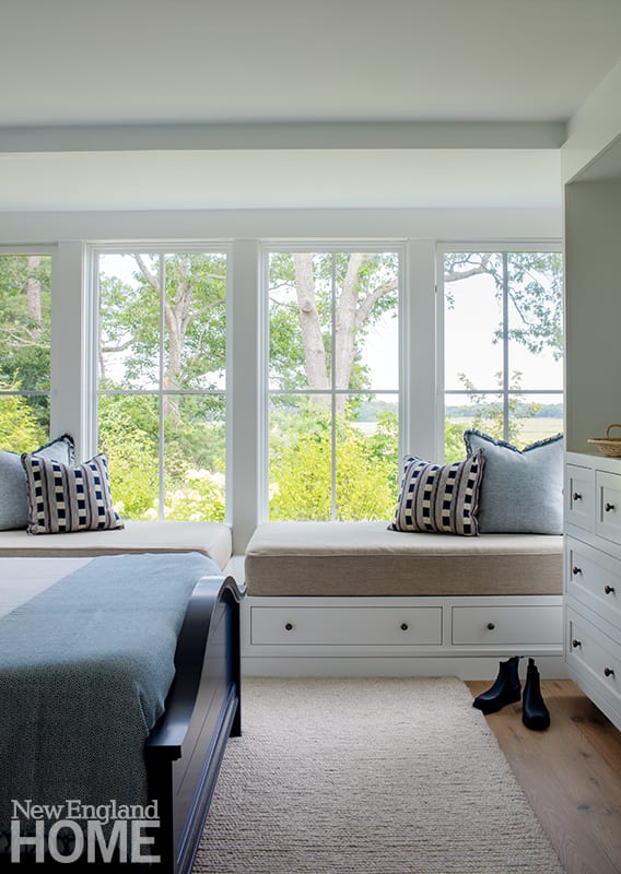 Liz Stiving-Nichols, who worked with Hutker for seven years before establishing her own firm, Martha’s Vineyard Interior Design, instinctively let the architecture take center stage by keeping furnishings quiet and natural. “We chose to include things that had character, but also simple organic textures and some scale,” she says. The black Windsor dining chairs, for example, have enough visual height to hold their own against the windows behind them, but also yield to the view.