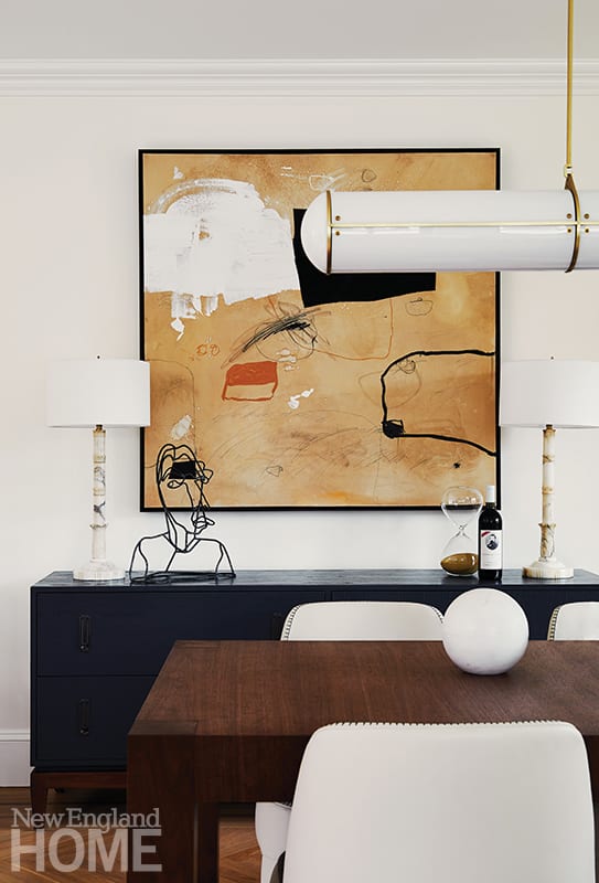 When it came to the inside, Zarba says, “One of the toughest themes we faced was what to keep and what to get rid of.” The fussy arches between rooms had to go, all agreed. Same with the brick fireplace in what had been the living room. Now, the expansive space holds the dining room as well as a sunny sitting area. The wainscoting and ceiling beams were removed here but left intact and painted white in what is now the living room.