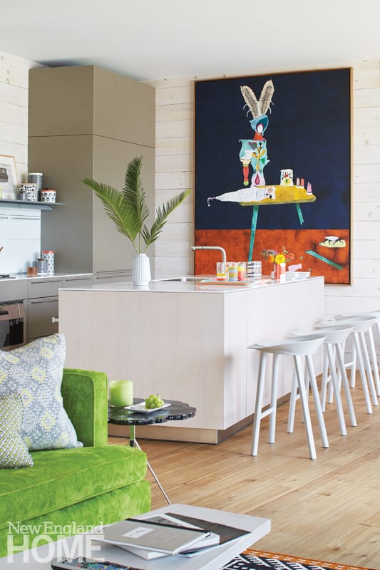 The playful, energetic colors in the cottage were inspired by an eye-catching painting by Gert and Uwe Tobias that hangs beside the kitchen counter. “We wanted the home to have a clean, European look,” the designer says. “We were not particularly interested in an American country vernacular. If we had used traditional beach or lake things, it would have worked—but it wouldn’t have been as much fun.”