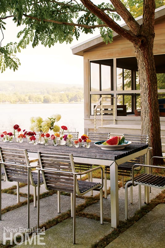 Because the cottage’s only porch is up on the second floor, outside the bedrooms, the homeowners asked Dana to design a screen house for enjoying protected outdoor time. The structure, which looks out over the lake, of course, is separated from the main house by a shady courtyard and patio. Young created a lawn by bulkheading the slice of lakefront belonging to the property, using large blocks of local granite reclaimed from old bridge abutments.