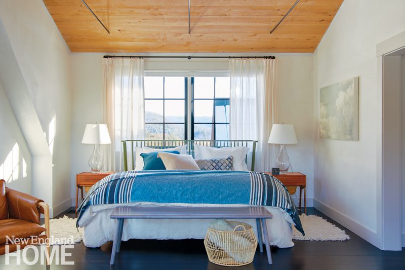 Color appears mainly through rugs and upholstery, in shades that echo the trees, hayfields, stone outcroppings, and sky outside the windows. Furnishings typify the modern-traditional mix for which the firm is known. The dining room, says Hendricks, “blends the humble simplicity of a farm table with modern lighting by Paavo Tynell.”The primary bedroom, she says, “is a nod to early American Windsor furniture, but made modern with an extra-high headboard.” These she paired with Hans Wegner sewing tables that double as nightstands.