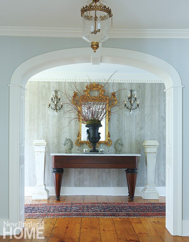The mix of woodsy and fabulous begins in the hallway off the living room, where Eastman hung Nobilis wood-grain wallpaper and layered it with antique crystal sconces and a marble-topped console that holds a pair of stone horse heads. A nearby powder room features the existing old marble sink, but now the walls are clad in paper with a birch-tree motif that mimics the outdoor views.