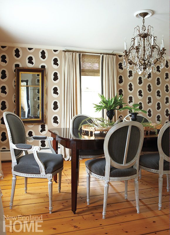 In the master bedroom’s dressing area, walls covered with a tromp l’oeil paper of gray-hued books surround a fringed ottoman. Downstairs in the dining room, another wall covering—this time by Osborne & Little featuring dozens of silhouettes—bridges the gap between whimsical and traditional. “It’s not too serious, but still traditional,” says Eastman. “This isn’t necessarily something you’d want to live with every day, but they’re not here every day.”