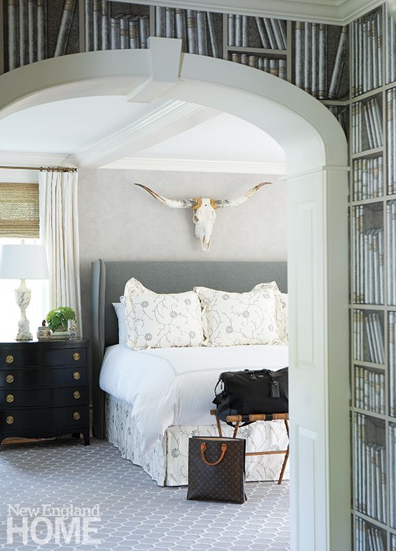 Similar accents find their way into the master bedroom, where a giant longhorn skull hangs above the bed against a cowhide-esque Donghia wallpaper.