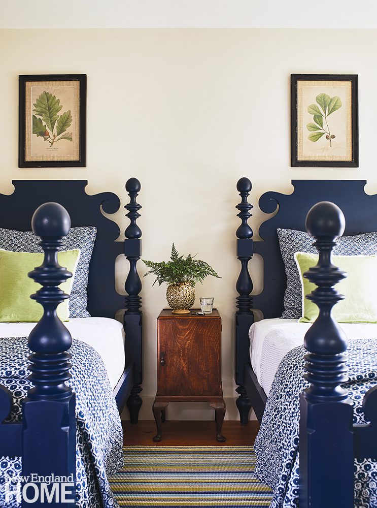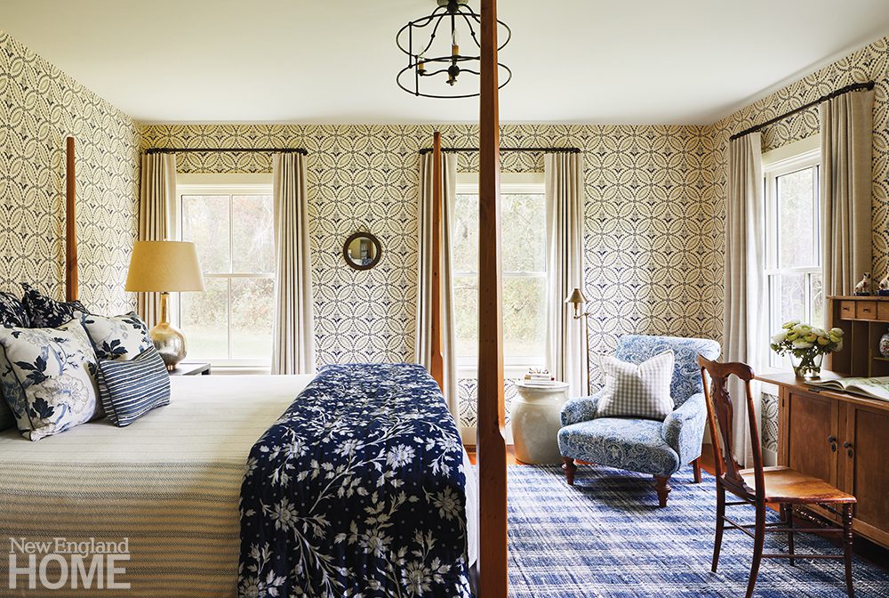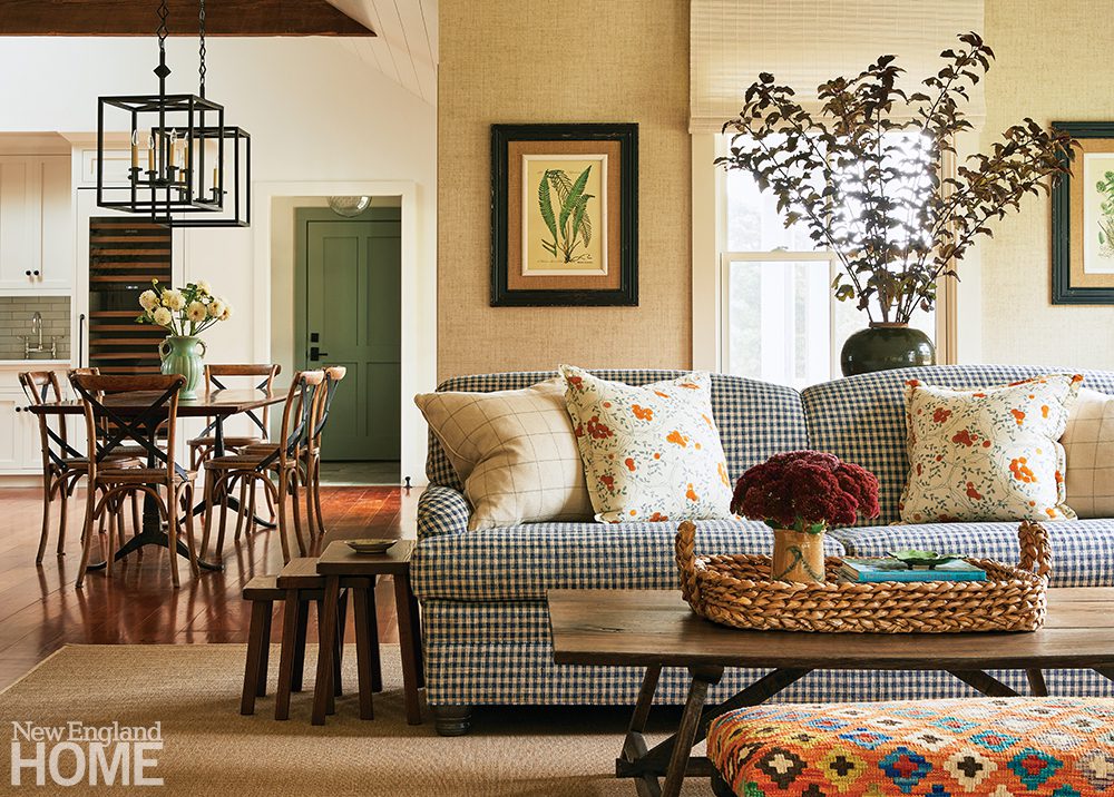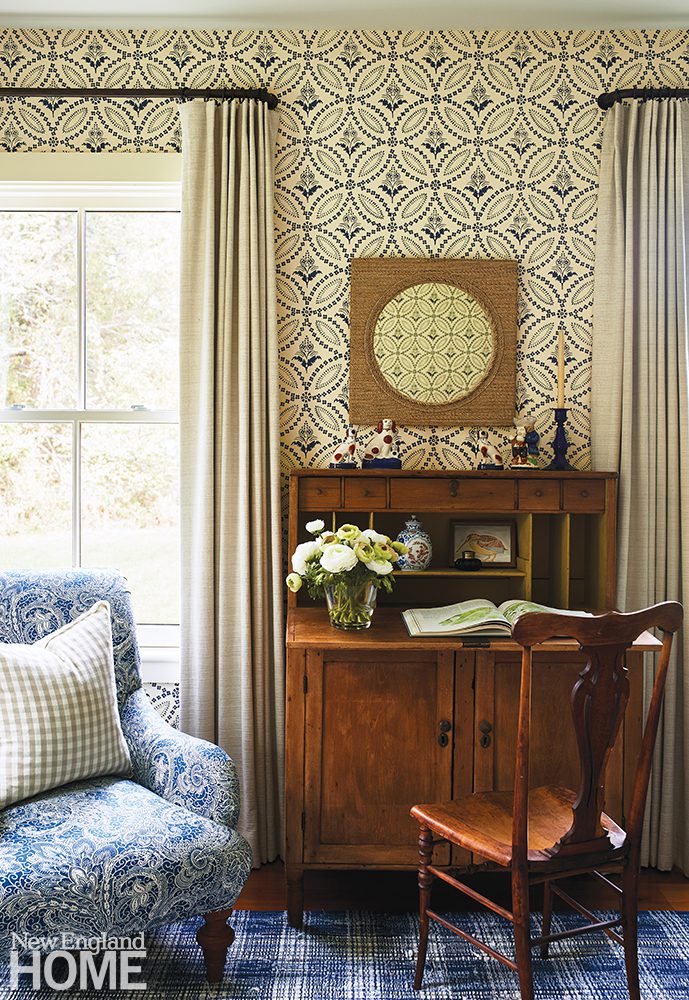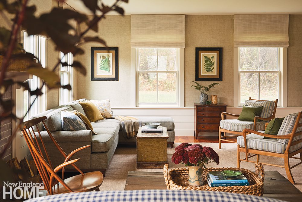 Though the home was built in 2019, the design team’s thoughtful touches detract from its newness. A grasscloth wallcovering in the living room hearkens back to the farm that originally stood on the land, explains Carrier. Reclaimed old-growth yellow-pine floors convey timelessness. Sourced from Cataumet Sawmill, the floors purportedly originated from McLean Hospital in Belmont, Massachusetts, during the time when the hospital treated some of its most famous patients. “Not everyone can say Sylvia Plath and James Taylor walked on their floors,” says the wife with a laugh.